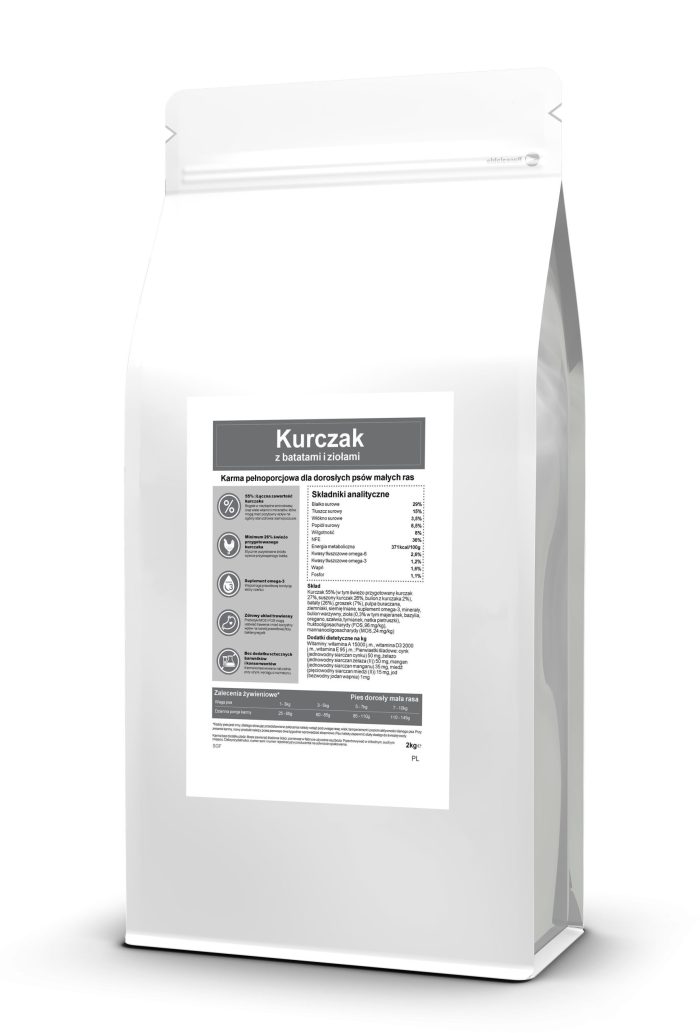 80,00złKURCZAK Z BATATAMI I ZIOŁAMI MAŁE RASY 2KG karma bez zbożowa,bez sztucznych barwników i konserwantów,konserwowana wyciągiem z rozmarynu łączna zawartośc KURCZAKA :55% Minimum 27% świeżo przygotowanego kurczaka Zdrowy układ trawienny – prebiotyki MOS(mannooligosacharydy) i FOS (fruktooligosacharydy), które mogą ułatwiać trawienie i mieć korzystny wpływ na rozwój prawidłowej flory bakteryjnej jelit. Suplement Omega-3 – wspomaga prawidłowa kondycje skóry…