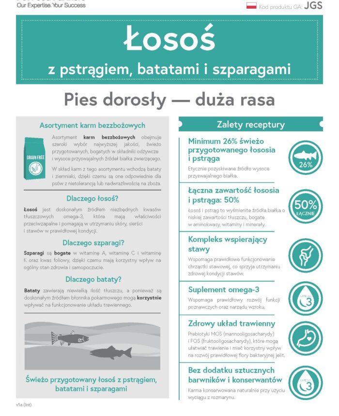 180,00złŁOSOŚ Z PSTRĄGIEM ,BATATAMI I SZPARAGAMI MAŁE RASY 6 KG karma bez zbożowa,bez sztucznych barwników i konserwantów,konserwowana wyciągiem z rozmarynu łączna zawartośc Łososia i Pstraga :53% Minimum 26% świeżo przygotowanego łososia i pstraga Zdrowy układ trawienny – prebiotyki MOS(mannooligosacharydy) i FOS (fruktooligosacharydy), które mogą ułatwiać trawienie i mieć korzystny wpływ na rozwój prawidłowej flory bakteryjnej jelit….
